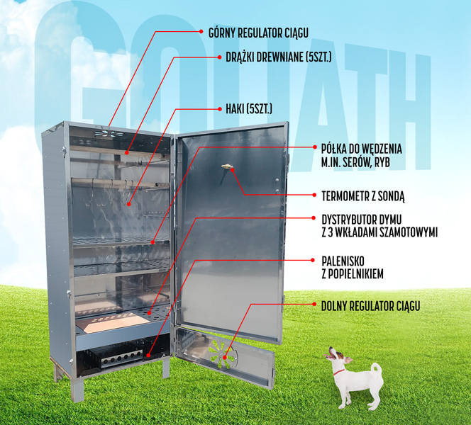 Wędzarnia wykonana jest ze specjalnego - bardzo wytrzymałego gatunku stali nierdzewnej AISI409L, który przeznaczony jest głównie do produkcji katalizatorów spalinowych. Gwarantuje to dużą odporność na skoki temperatur i wieloletnie użytkowanie. Pamiętajmy, że stal nierdzewna ma o wiele wyższy moduł sprężystości niż stal czarna, przez co wędzarnia nie odkształca się przy wysokich temperaturach. Goliath ma 3 ściany izolowane wełną mineralną.